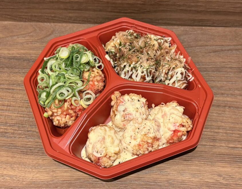 추천 메뉴는 원하는 맛을 3가지 선택할 수 있는 ‘선택할 수 있는 3종 모둠’입니다. 소스, 소금, 튀김용 맛간장, 간장, 파 폰즈 소스, 치즈 등 다양한 종류 중에서 취향에 맞는 조합을 즐길 수 있습니다. 특히 술과 함께 즐긴다면 아주 차가운 ‘가쿠 하이볼’이 찰떡궁합입니다. 다코야키의 고소함을 한층 더 돋워 줍니다.